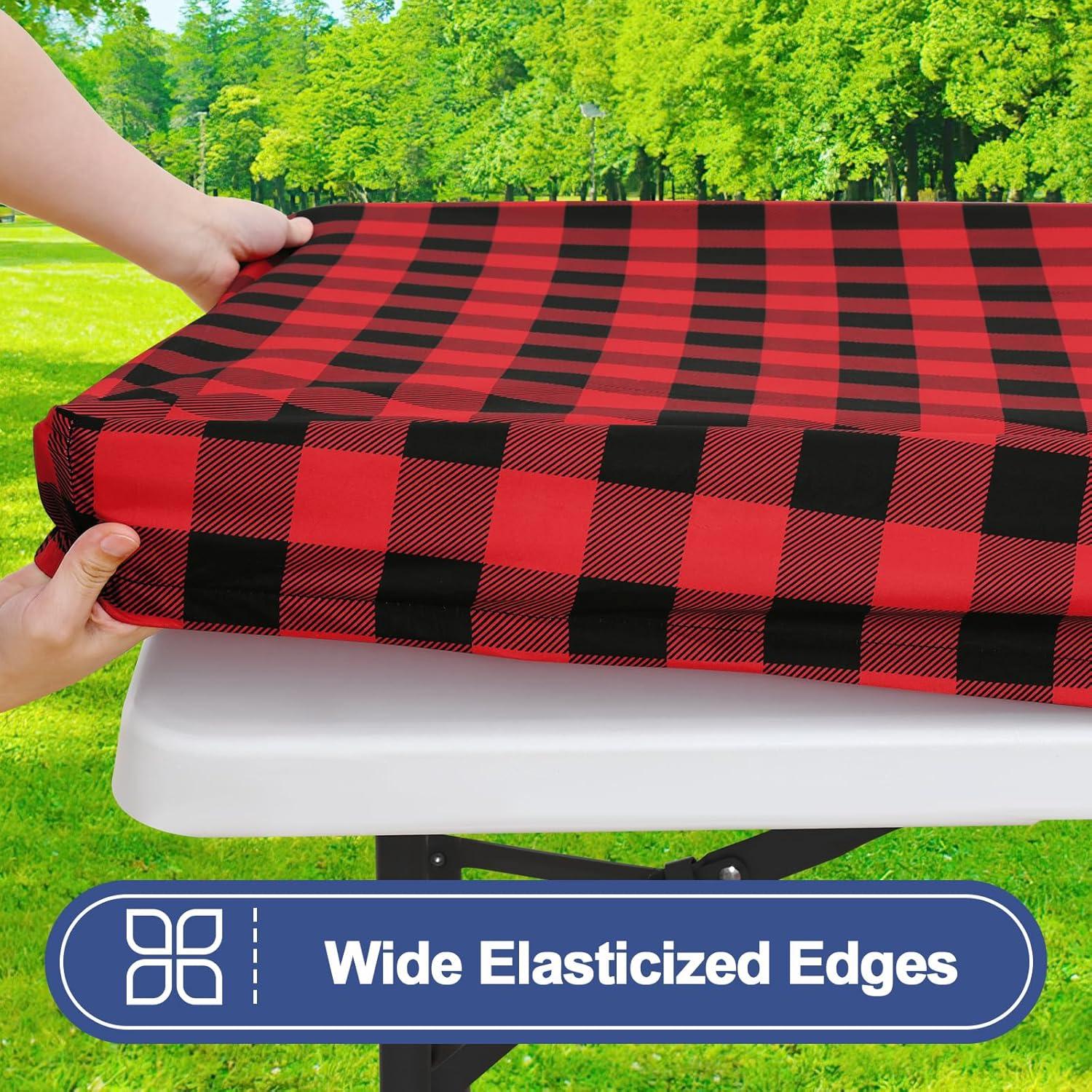 Smiry Picnic Table Cloth 2 Pack, Waterproof Elastic Fitted Tablecloths for 6FT Rectangle Tables, Washable Polyester Buffalo Plaid Tablecloth for Camping, Dining & Outdoor (Black & White, 30″ x 72″)(Black and Red)