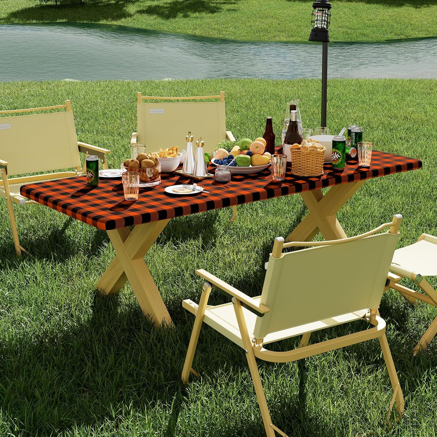 [Windproof & Elastic Edge] Smiry picnic tablecloth's elastic edge ensures a snug fit, eliminating the need for clips or clamps. It stays securely in place, even on breezy days, for hassle-free outdoor meals.