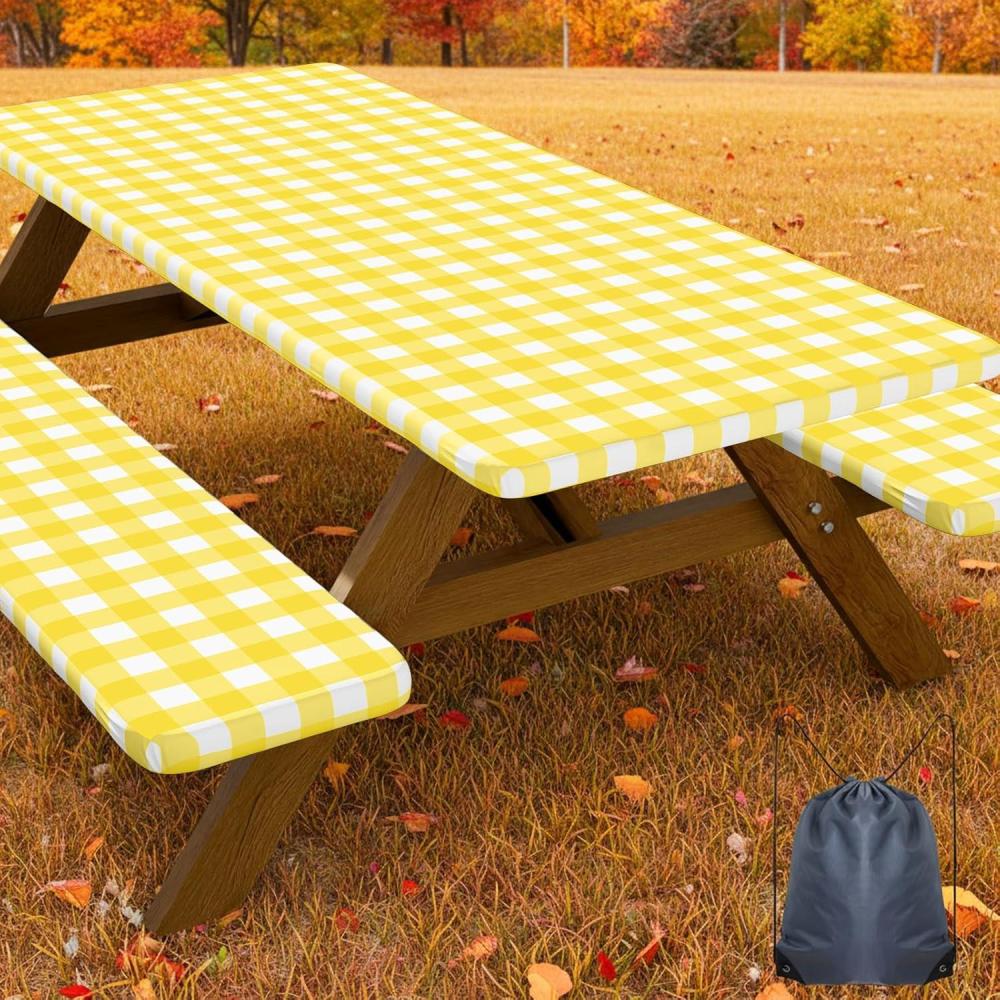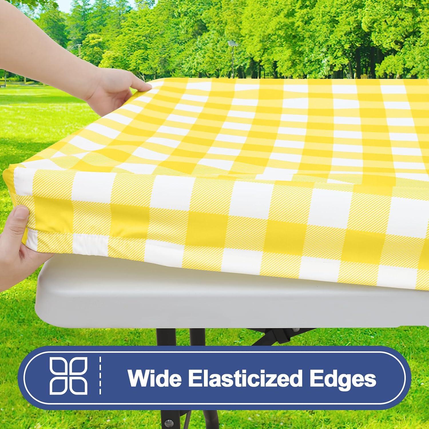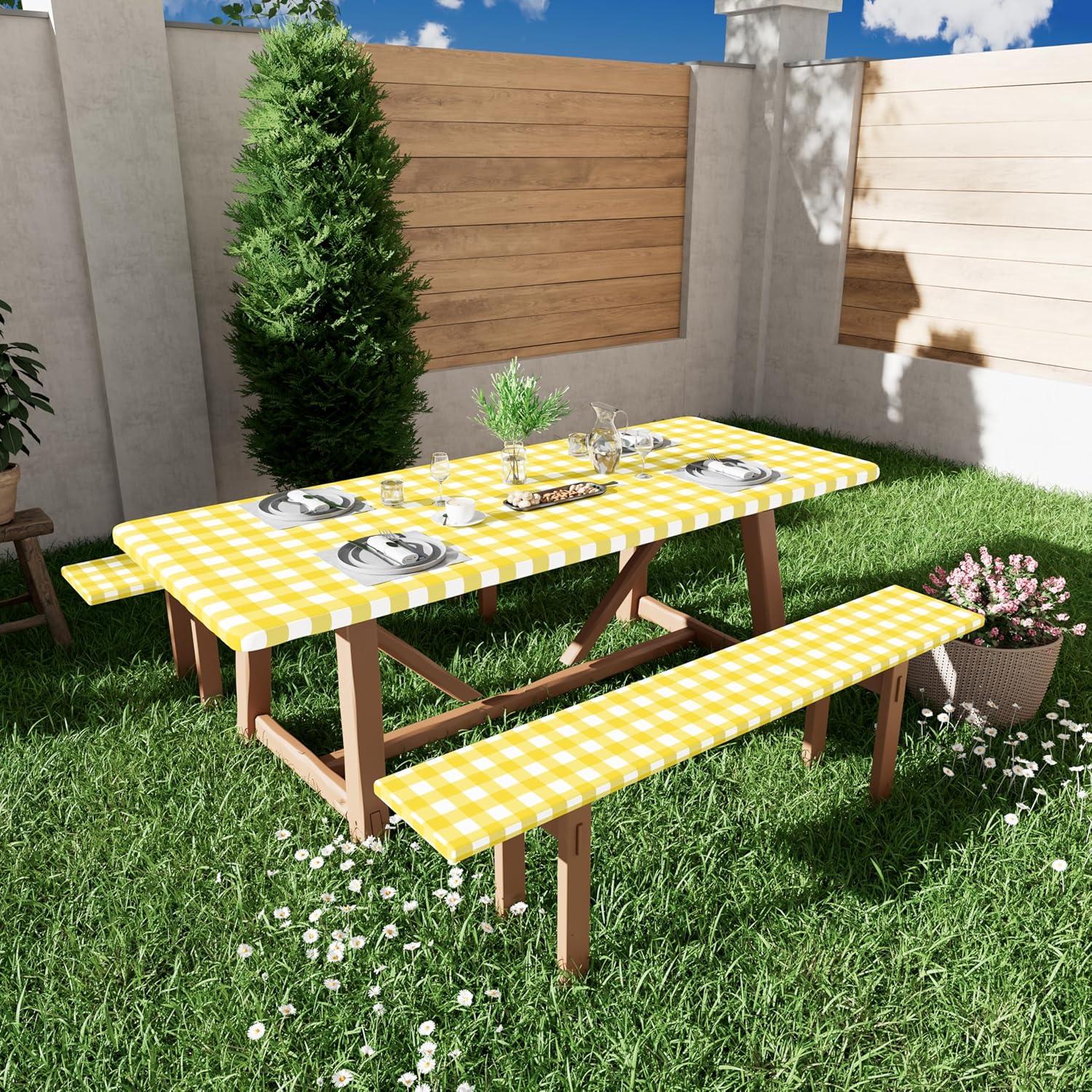 Smiry Picnic Table Cover with Bench Covers, Waterproof Elastic Fitted Tablecloths for 6 Foot Rectangle Tables, Washable Buffalo Plaid Tablecloth for Camping, Outdoor (Black & White, 30"x72")(Yellow and White)