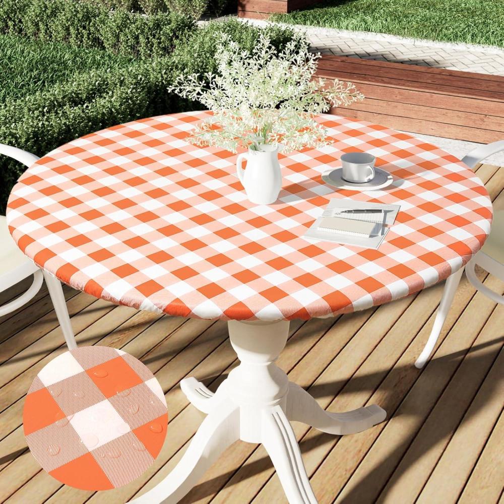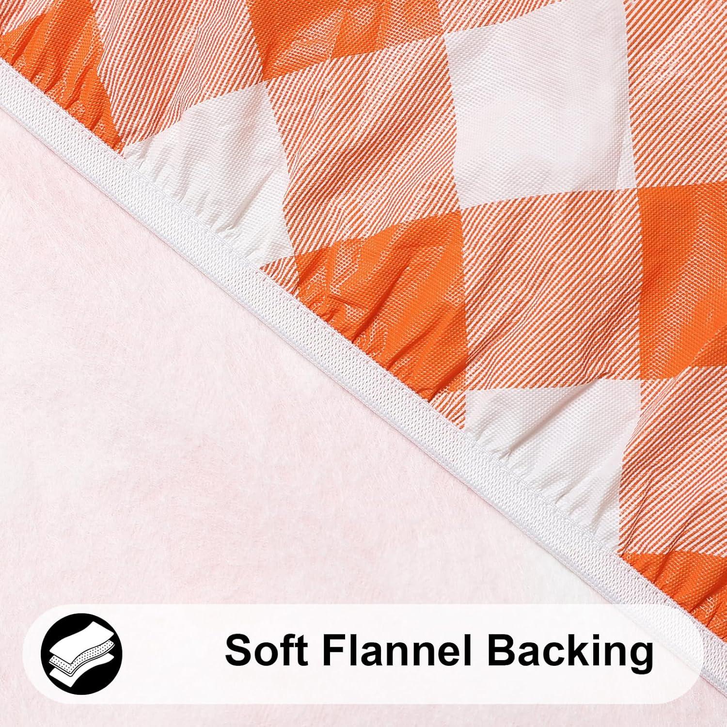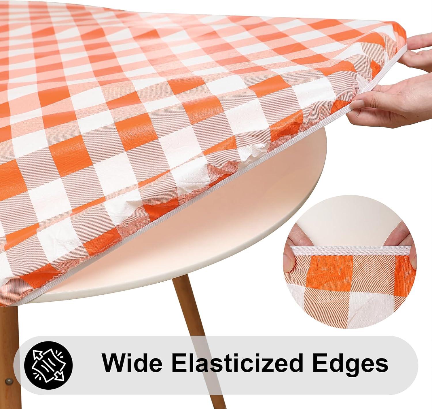 Smiry Round Picnic Table Cloth, Elastic Waterproof Fitted Vinyl Tablecloth for 36"-44" Tables, Flannel Backed Buffalo Plaid Table Covers for Dining, Camping, Outdoor, Black and White(Orange and White)